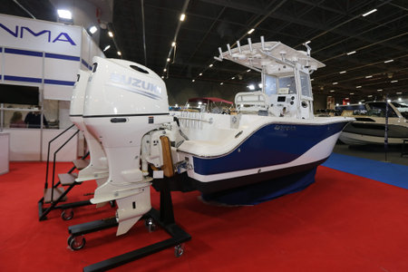 Toronto, ON, Canada - January 20, 2026: New wake boat showcased at Toronto nautical trade show, highlighting modern design, marine sports lifestyle, and industry innovation