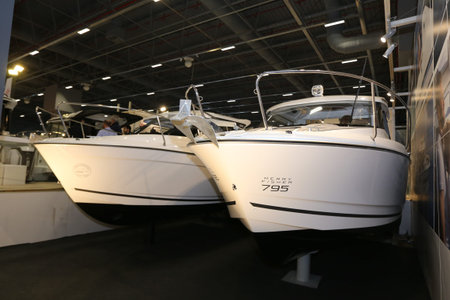 ISTANBUL, TURKEY - FEBRUARY 22, 2020: Boats on display at CNR Eurasia Boat Show in CNR Expo Center