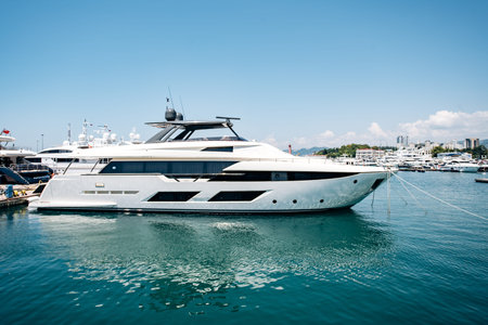 Luxury marina. Motorboat yacht sailing at sea. Yachting boat tourism. Motorboat sea marina. Luxury yacht marina. Docked luxurious yacht boat. Luxury trip. Motorboat at sea. Summer vacation