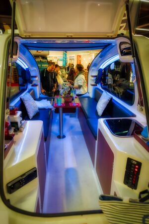 BERN, SWITZERLAND – OCTOBER 26, 2019: Look into a new camper van with modern interior on swiss caravan salon