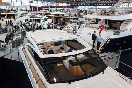 Monaco, Monte-Carlo, France, September 27, 2018: Moments from the annual Monaco Yacht Show, focusing on luxury power boats. Checkmate by Wally Yachts. Port Hercules, rich brokers, having fun.
