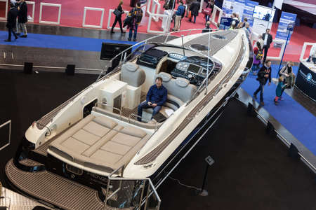 ROME, ITALY - FEBRUARY 16, 2014: At Fiera di Roma, during the Big Blue Expo, the stand of La Baia Nautical s.r.l. presenting the Venere 28 boat.