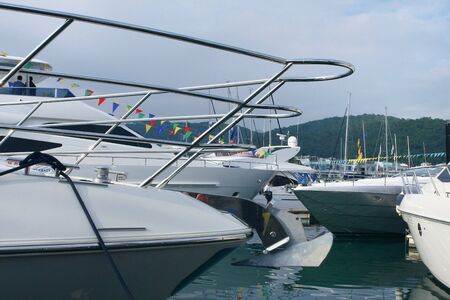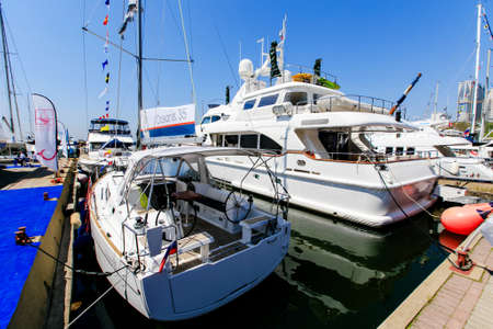 Summer, 2016 - Vladivostok, Primorsky region - Beautiful yachts and boats are in the yacht club. Snow-white yachts against the blue sky.
