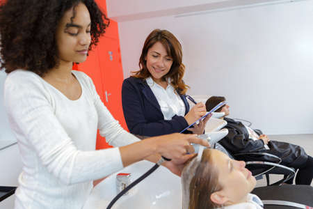 two young hairdresser dyeing hair of female client while she looks to her mobile