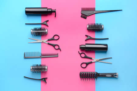 Detail of accessories for hair cutting and styling on white table. Top view. Landscape composition.
