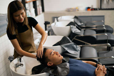 Asian expert Hairdresser massaging and washing hair of young customers. Beautiful girl customer lying down on salon washing bed, feel relax and enjoy treatment from stylist in beauty salon or barber.