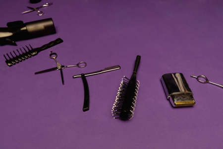 Tools for cutting beard barbershop. Male hairdresser with his equipment. Barber. Shaver. Scissors. Straight razor.