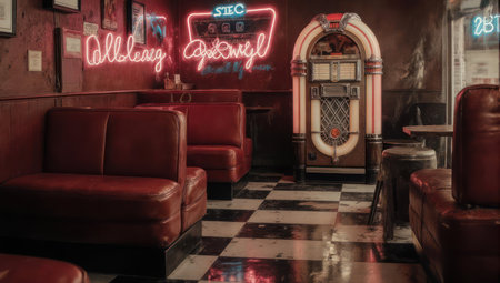 A classic diner interior featuring red booths, a jukebox, and neon signs, creating a retro atmosphere.