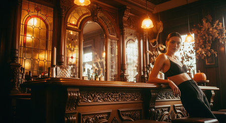 An interior space features wooden floors and walls with ambient lighting. Tables and small windows contribute to the visual composition. The environment suggests an indoor setting with potential uses in event photography or editorial purposes, offering copy space and a sense of depth.