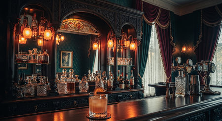 Vintage bar counter with glasses of whiskey, cognac, wine
