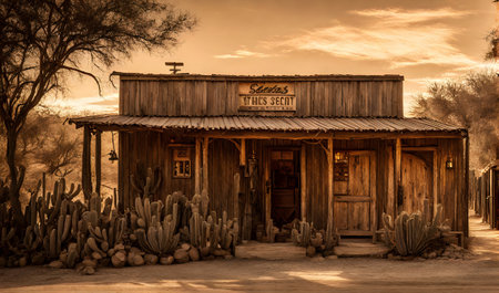 Wild West journey: Old saloon, dusty road winds through arid land with iconic cacti