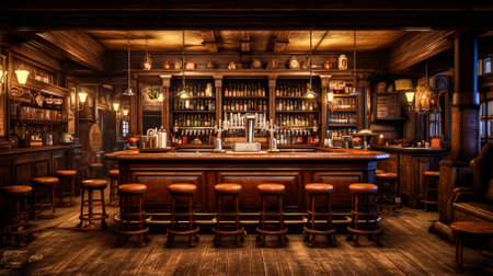 The rustic bar showcases wooden shelves filled with various liquor bottles, glassware, and a vintage cash register, creating a warm tavern atmosphere.