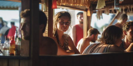 A bustling seaside bar comes alive during the summer. Vibrant conversations, clinking glasses, and the sound of laughter fill the air, creating a lively and festive atmosphere. AI Generative AI