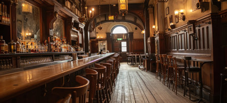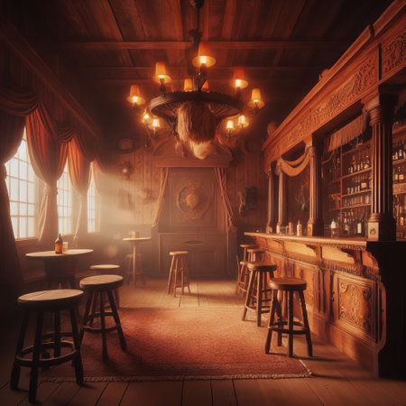Vintage saloon bar with wooden furniture and a chandelier, creating a warm and inviting atmosphere