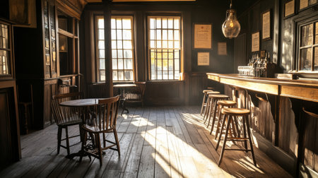 The tavern features a warm, inviting atmosphere with wooden tables and stools. Sunlight streams through large windows, illuminating the aged wooden floor.