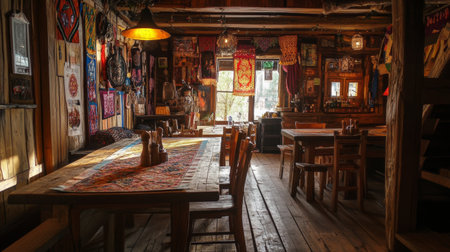 The inviting dining area features sturdy wooden tables and warm lighting, surrounded by colorful wall hangings, creating a homely atmosphere for guests at dusk.