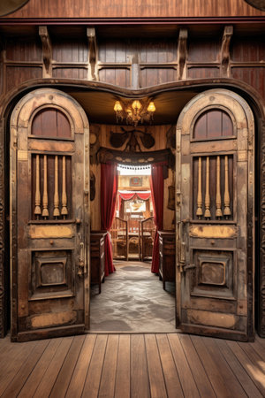 Vintage wooden doors with inviting neon 'OPEN' signs, entrance to a cozy establishment