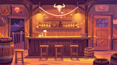 An empty western saloon interior with wooden furniture, swinging door, beer pints on tables, chairs, counter, barrels, bottles, and a bull skull. Cartoon modern pub..