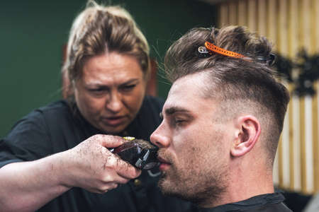 Young unshaven man in barbershop, woman hairdresser trims beard to client.