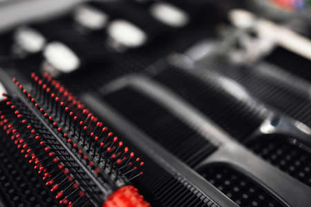 Many different combs for cutting hair. Hairdresser's working tool. Equipment at the workplace of barber master