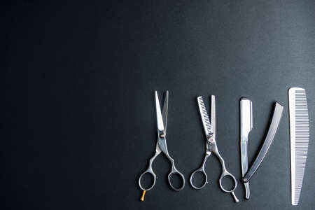 Barber shop. Close-up of barber tools for cutting hair in a male hairdresser. Baner copyspace