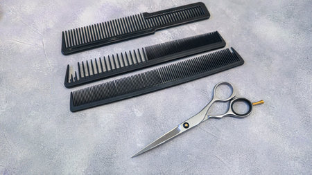 Special hairdressing scissors and comb. professional equipment. copyspace.