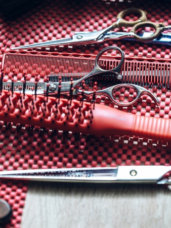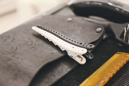 Barber tool in barbershop. Hairdresser tool. Scissors, combs, razors, clippers. Tool for the wizard. Organization of the workplace. Selective focus