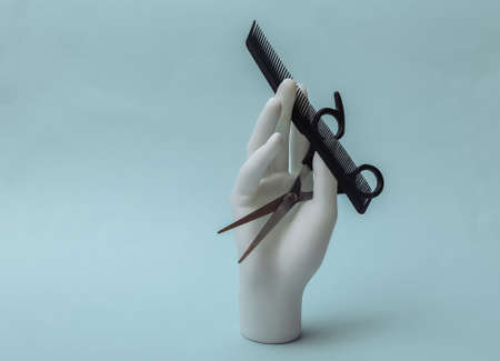 Mannequin hand holding hair scissors and comb on blue background. minimalist beauty concept