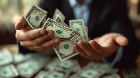 About closeup dollar banknotes, catching by businessman, generative ai.