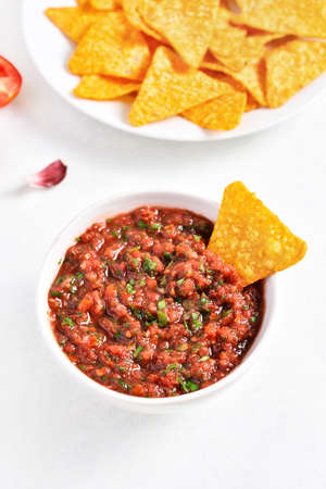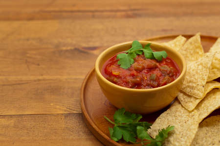 Mexican crispy tortilla chips with spicy red tomato salsa