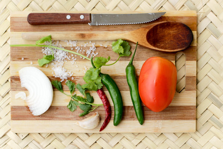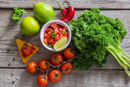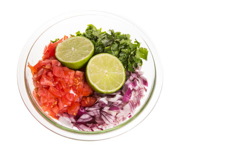 Ingredients for fresh salsa onion pepper tomato in bowl