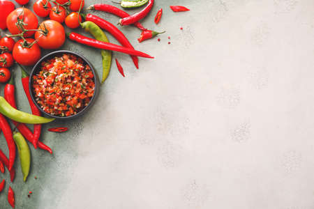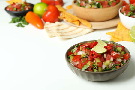 Tomato salsa in bowl over white stone background with free text space. Top view, flat lay