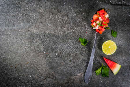 Mexican food. Summer berries and fruits. Vegetable salsa salad with watermelon, tomatoes, onions, greens, lime. In a spoon on a black stone table, with the ingredients. Top view copy space