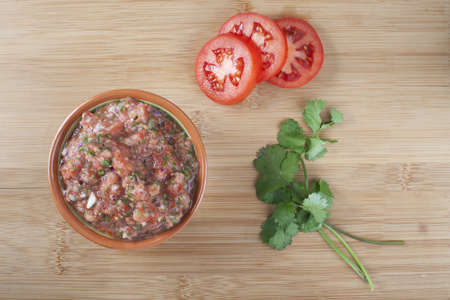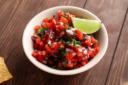 Traditional Mexican Pico de Gallo sauce in bowl on wooden table