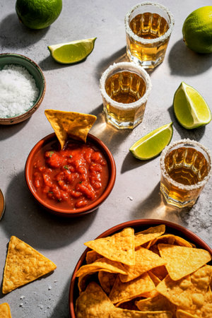A festive spread of tequila shots, tortilla chips, salsa, lime wedges, and salt, perfect for a celebratory gathering or casual get-together.
