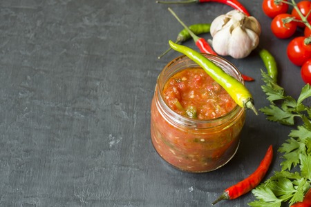 Sauce ketchup, Lecho in glass jar. Chili tomato cherry garlic and other spices on black background.