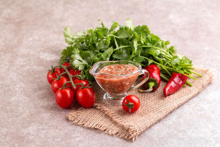 Armenian adjika of red pepper, tomatoes, garlic, cilantro and parsley in a bowl and jars on a gray background. View from above