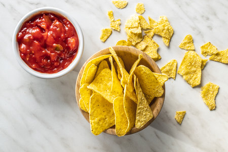 Tortilla chips and red tomato salsa dip. Mexican nacho chips on kitchen table.