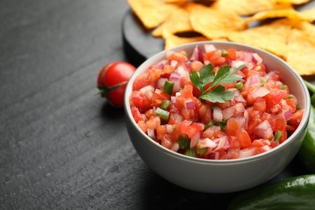 Mexican Pico de Gallo salsa and ingredients. Bowl of tasty Pico de Gallo salsa and nachos on dark background. Top view. Copy space