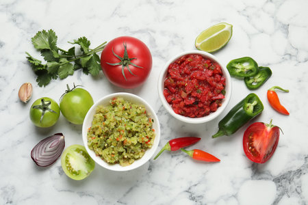 Tasty salsa in bowl and ingredients on white marble table, flat lay