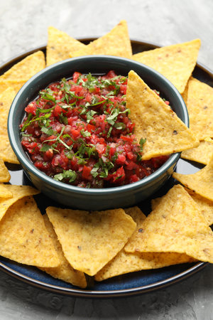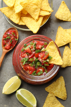 Tortilla chips with spicy tomato salsa. Mexican nacho chips