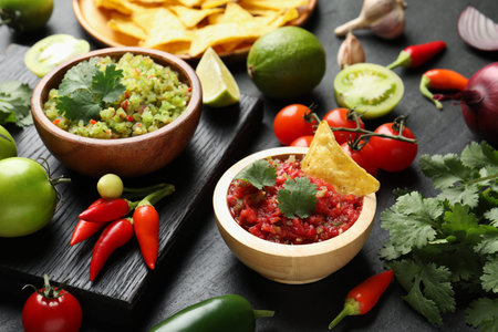 Traditional Latin American mexican salsa sauce and ingredients on black stone table.