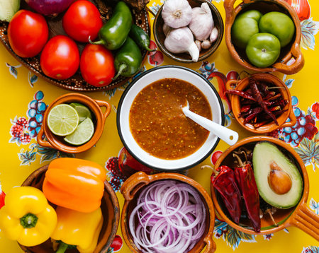 mexican salsa spicy sauce and ingredients on a table kitchen in Mexico city, Top view copy space.