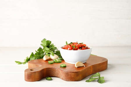 Composition with bowl of delicious salsa sauce and ingredients on brown wooden table