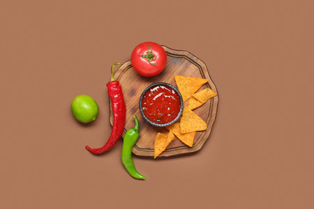 Wooden board with tasty salsa sauce, nachos and ingredients on brown background