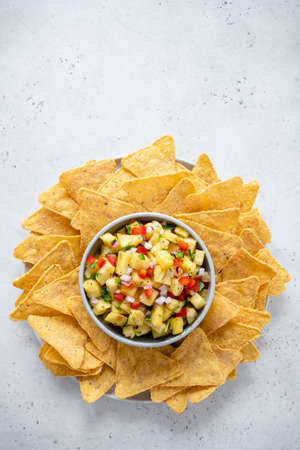 Homemade Corn Salsa with Tortilla Chips on a Plate, top view. Overhead, from above, flat lay. Copy space.