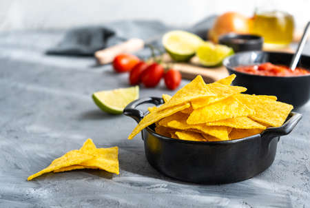 Traditional Mexican nachos tortillas in black bowl with tomato dip and basic ingredients aside
