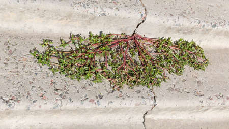 Creeping plant growing out of a crack in old concrete steps demonstrated ability for adaptability, fragment close-up