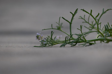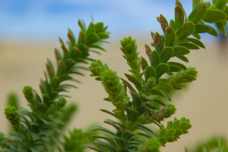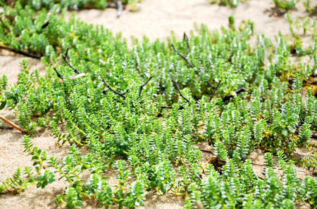 Close-up of Euphorbia paralias, also known as sea spurge, thriving on the golden sand dunes of Corralejo Natural Park in Fuerteventura, Canary Islands.