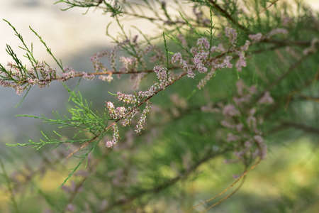 Multicolor bush of asparagus close-up. Beautiful small pink flowers blooming on bushes. Textured garden rich vegetation with copy space. Amazing vivid green natural background. Buds of sparrowgrass.